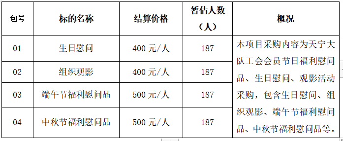 項目名稱:天寧大隊工會會員節(jié)日福利慰問品、生日慰問、觀影活動采購