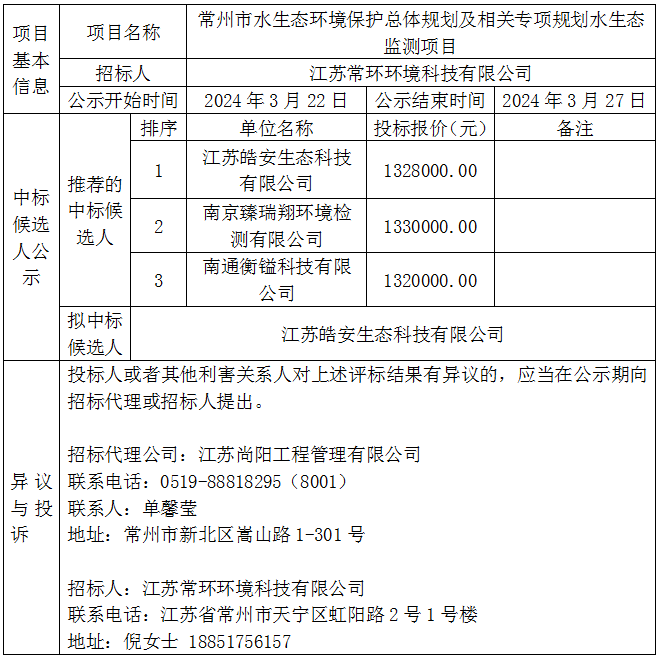 常州市水生態(tài)環(huán)境保護總體規(guī)劃及相關(guān)專項規(guī)劃水生態(tài)監(jiān)測項目中標候選人公示