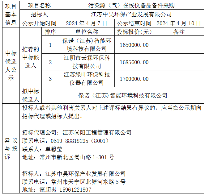 污染源(氣)在線儀備品備件采購中標候選人公示