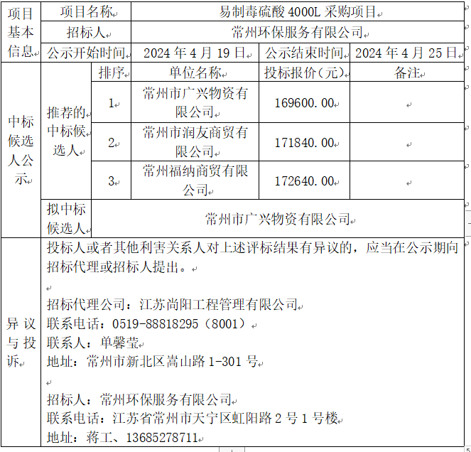 易制毒硫酸4000L采購項目中標(biāo)候選人公示