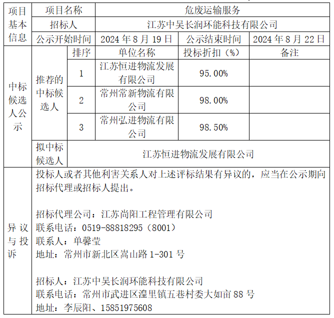 危廢運輸服務中標候選人公示