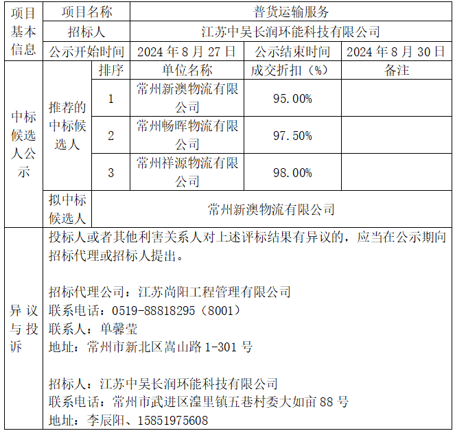 普貨運(yùn)輸服務(wù)中標(biāo)候選人公示