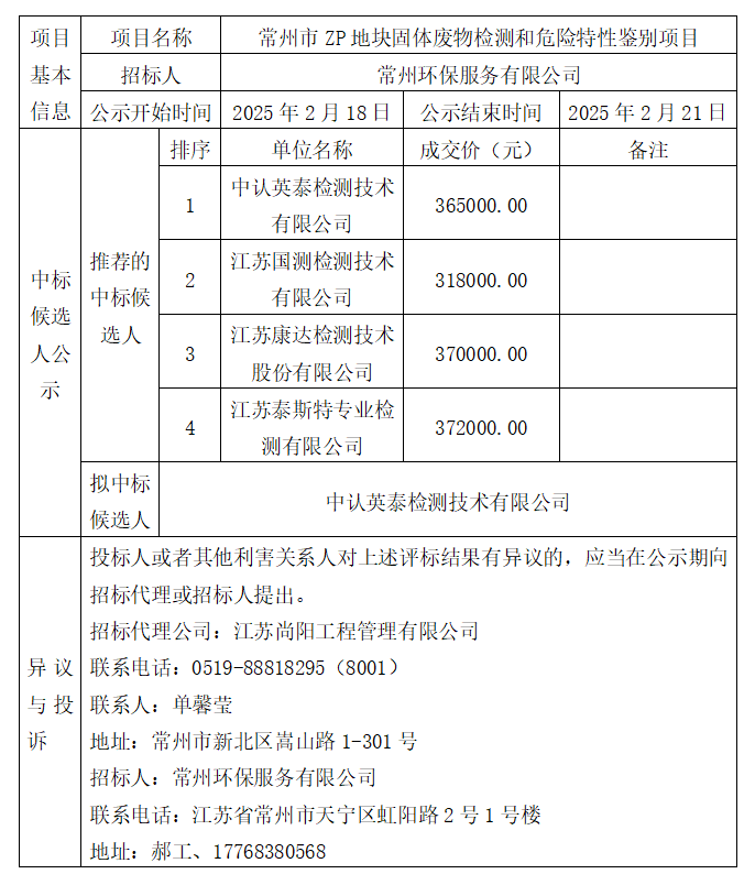 常州市ZP地塊固體廢物檢測和危險特性鑒別項目成交候選人公示