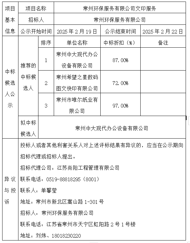 常州環(huán)保服務(wù)有限公司文印服務(wù)中標候選人公示