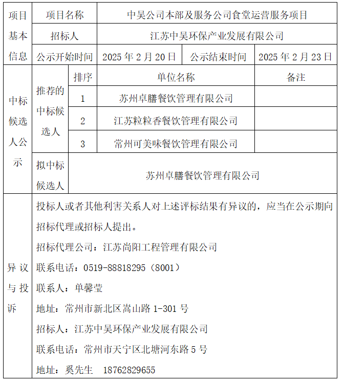 中吳公司本部及服務(wù)公司食堂運(yùn)營(yíng)服務(wù)項(xiàng)目中標(biāo)候選人公示