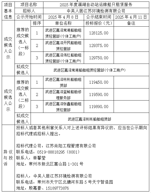 2025年度滆湖自動站運維船只租賃服務 成交候選人公示