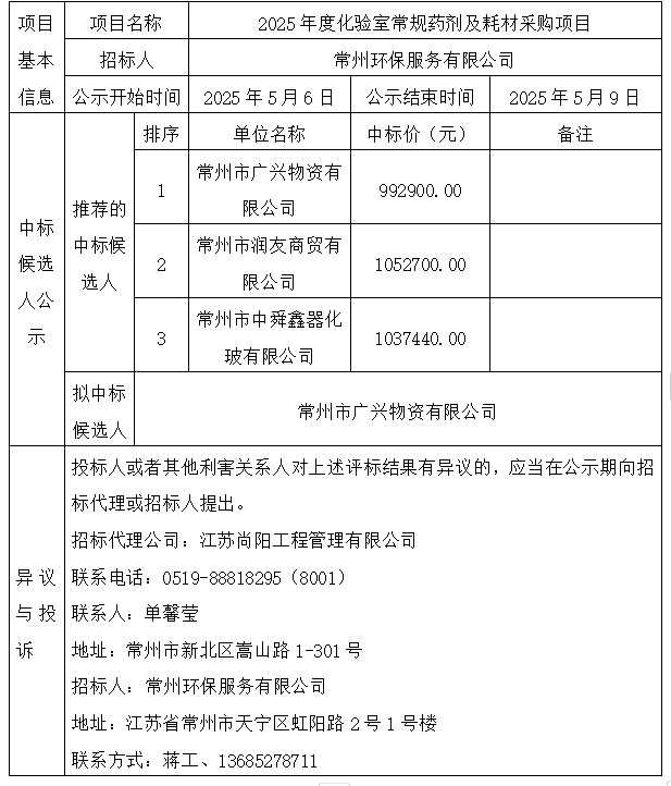 2025年度化驗室常規(guī)藥劑及耗材采購項目 中標(biāo)候選人公示