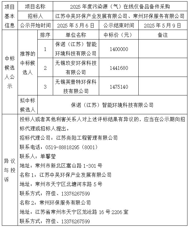 2025年度污染源(氣)在線儀備品備件采購中標候選人公示