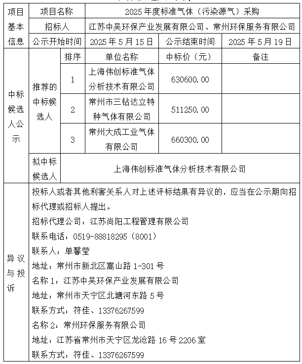 2025年度標(biāo)準(zhǔn)氣體(污染源氣)采購(gòu) 中標(biāo)候選人公示