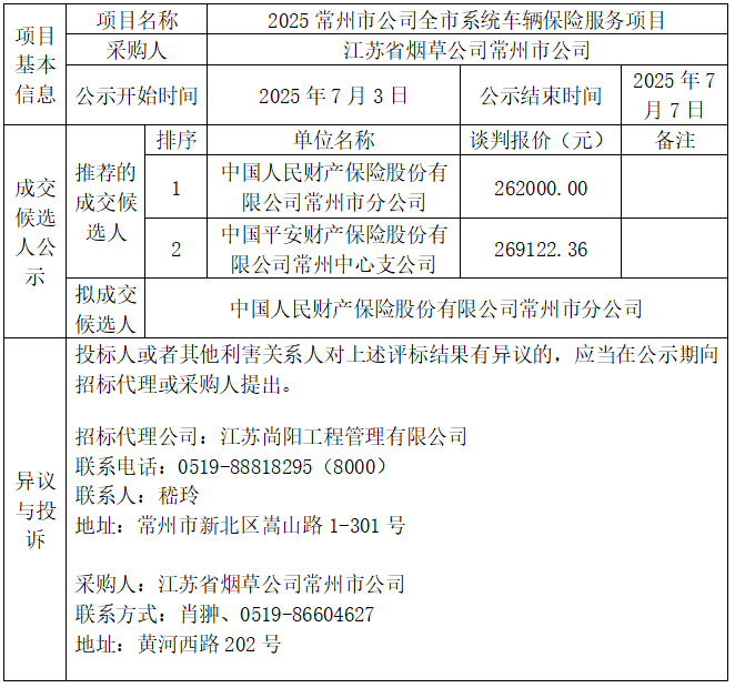 2025常州市公司全市系統(tǒng)車(chē)輛保險(xiǎn)服務(wù)項(xiàng)目成交候選人公示