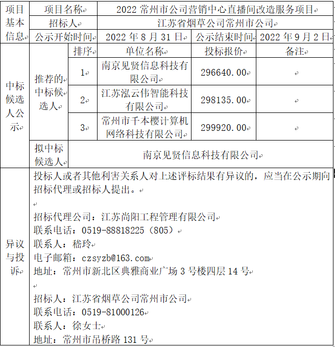 2022常州市公司營(yíng)銷中心直播間改造服務(wù)項(xiàng)目中標(biāo)候選人公示