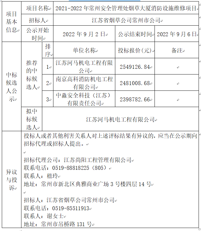 2021-2022年常州安全管理處煙草大廈消防設(shè)施維修項(xiàng)目中標(biāo)候選人公示